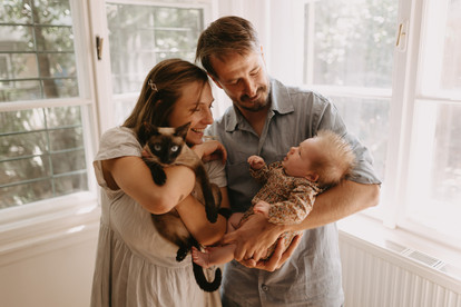 Hozzájuk belépve pedig rá kellett döbbennem még valamire: Ez a kicsilány nem csak Clau és Máté életét változtatta meg, hanem egy kisebb állatseregét is, ugyanis Acsa mellett egy cicmók is a ház lakója, aki szintén anyukává vált nem is olyan rég. :) Hihetetlen volt látni, ahogyan a négylábú családtagok le nem vették a szemüket Johiról, ha kicsit is felsírt, már is ott termettek körülötte. 🥰 Egyszerűen imádtam! Olyan jó, amikor a szőrös családtagok is kiveszik a részüket a családi pillanatokból ❤️