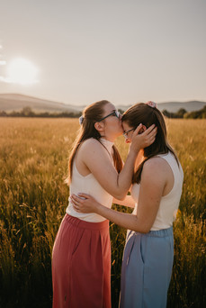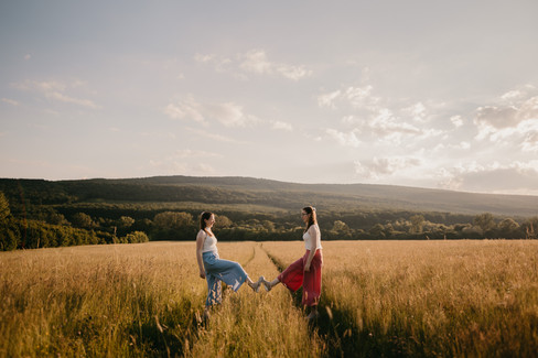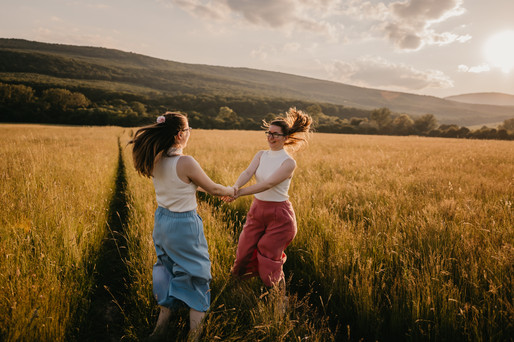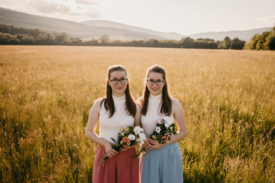 Kata és Laura, felnőtt ikertestvérek önfeledt fotózása a természetben.